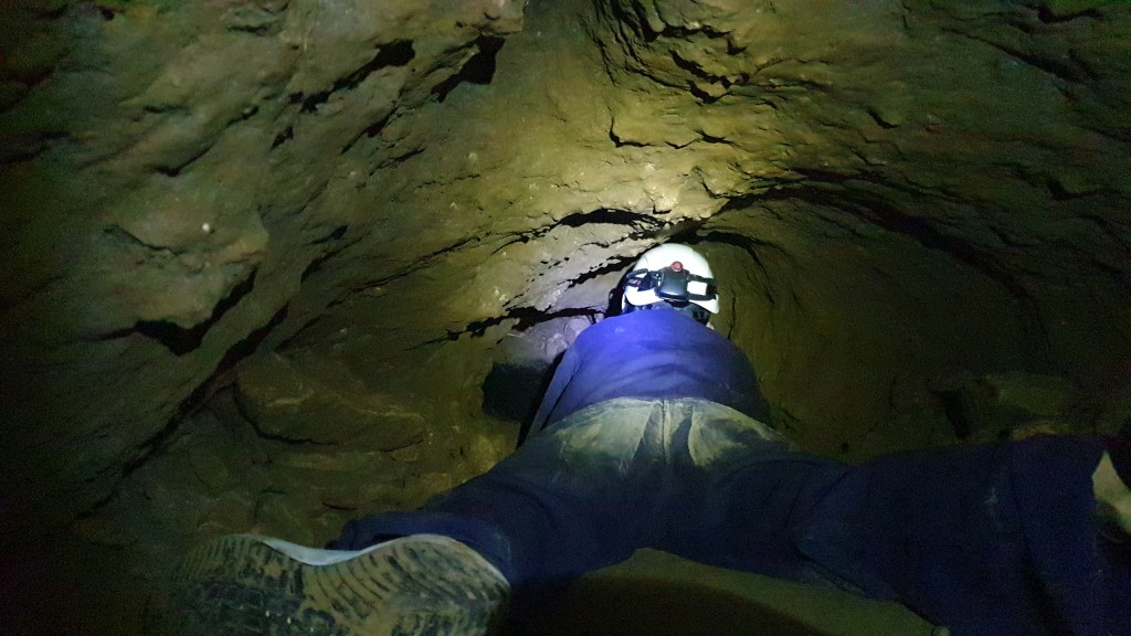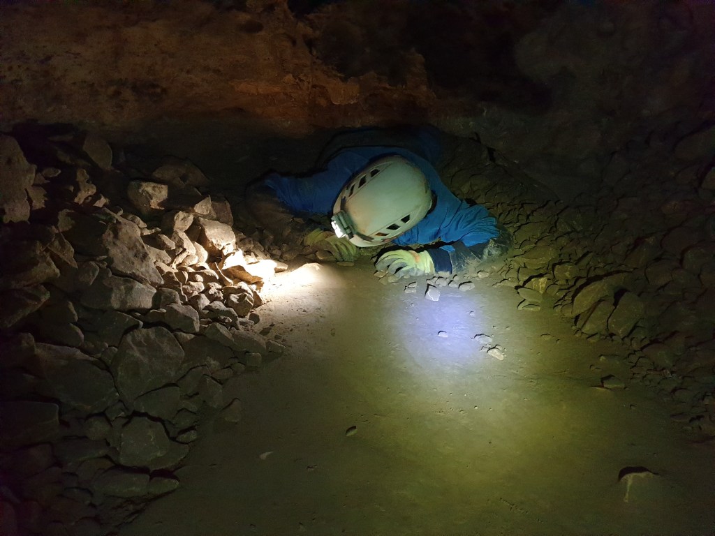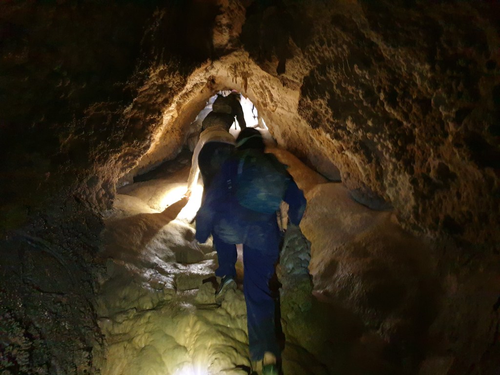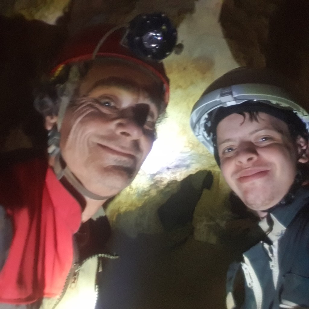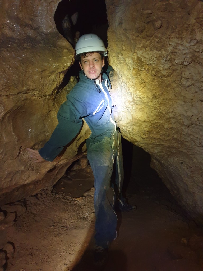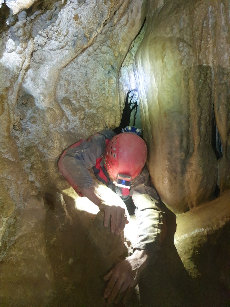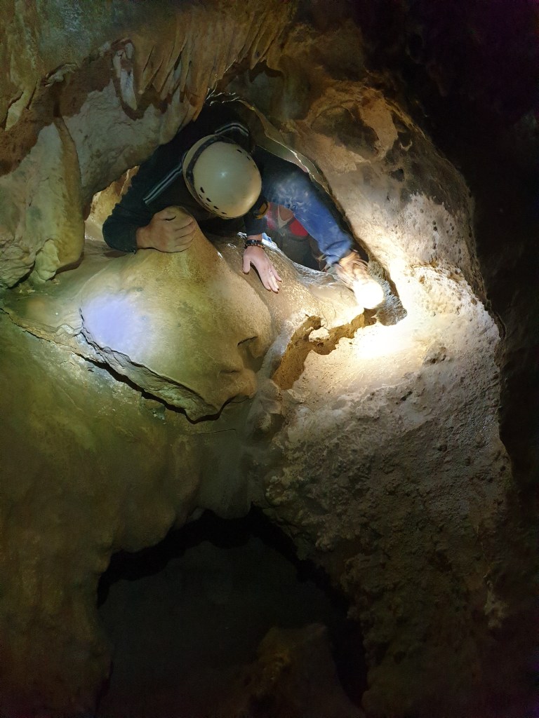 🔦 exploré la grotte en tenue de spéléo et casque avec lampe frontale,